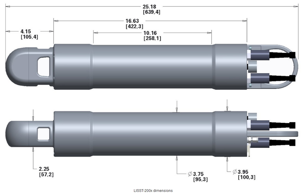 Sistema compuesto del LISST-200X con batería externa grande y cable de 0.5m. Requiere un montaje con boyas subacuáticas y aleta giratoria para mantener la orientación de la celda del LISST-200X hacia la dirección de la corriente. O tripie de fondo.